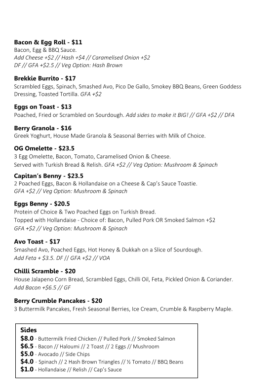 - Sides: A range of accompaniments including buttermilk fried chicken, pulled pork, bacon, haloumi, eggs, mushrooms, avocado, chips, hash browns, and various sauces and relishes.
