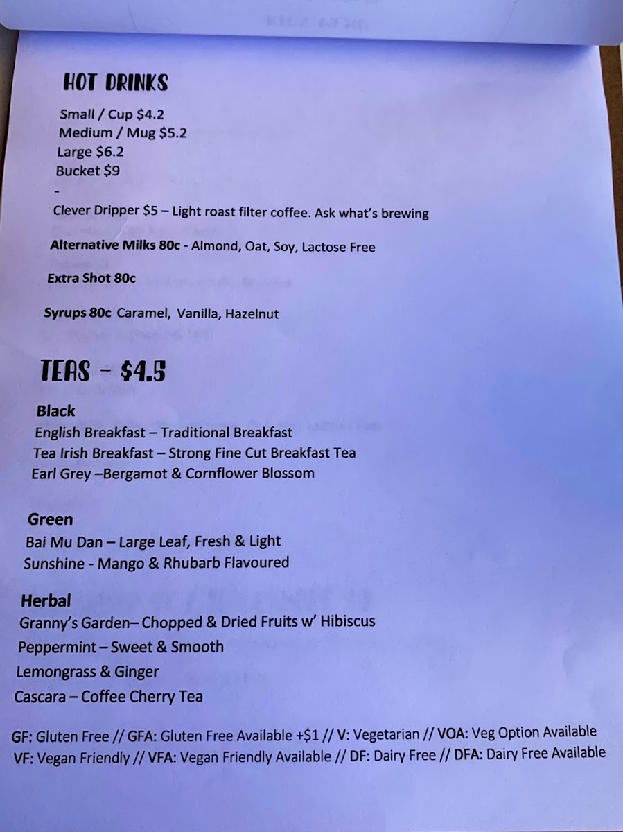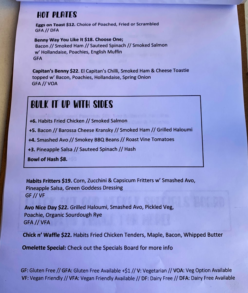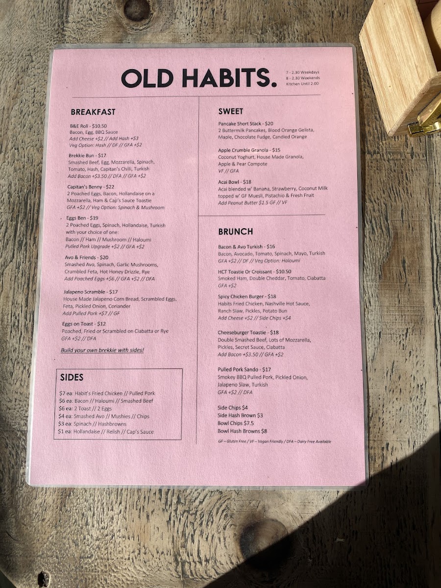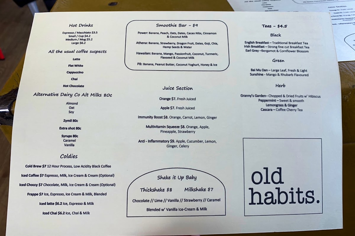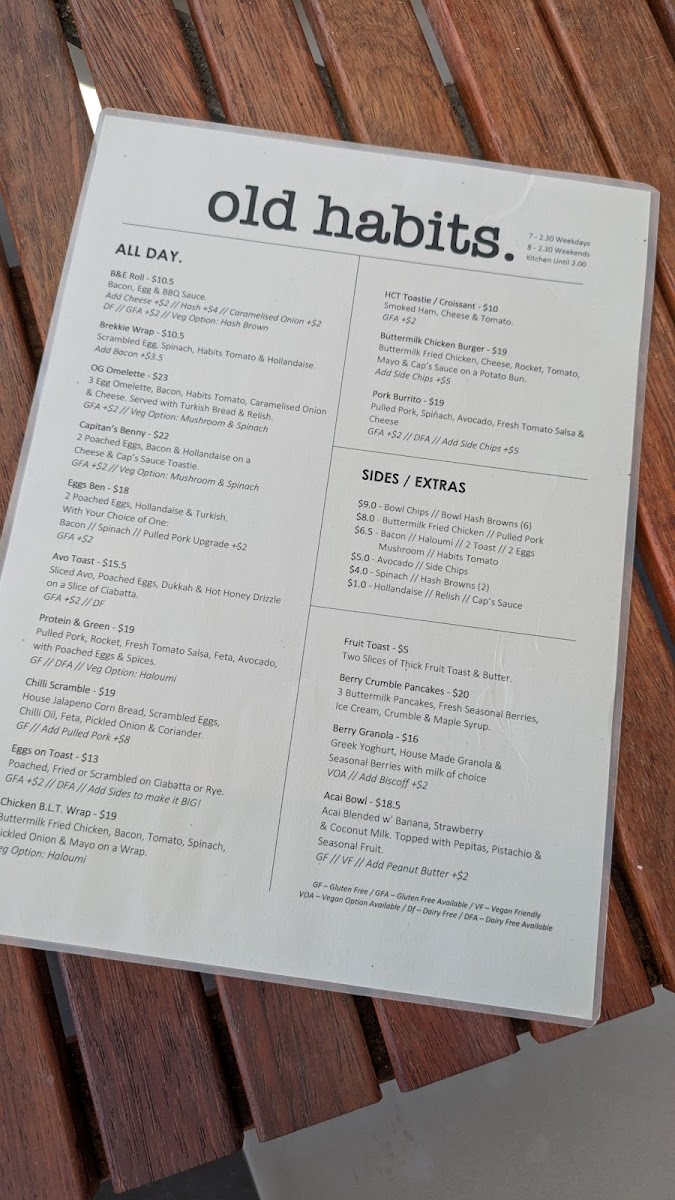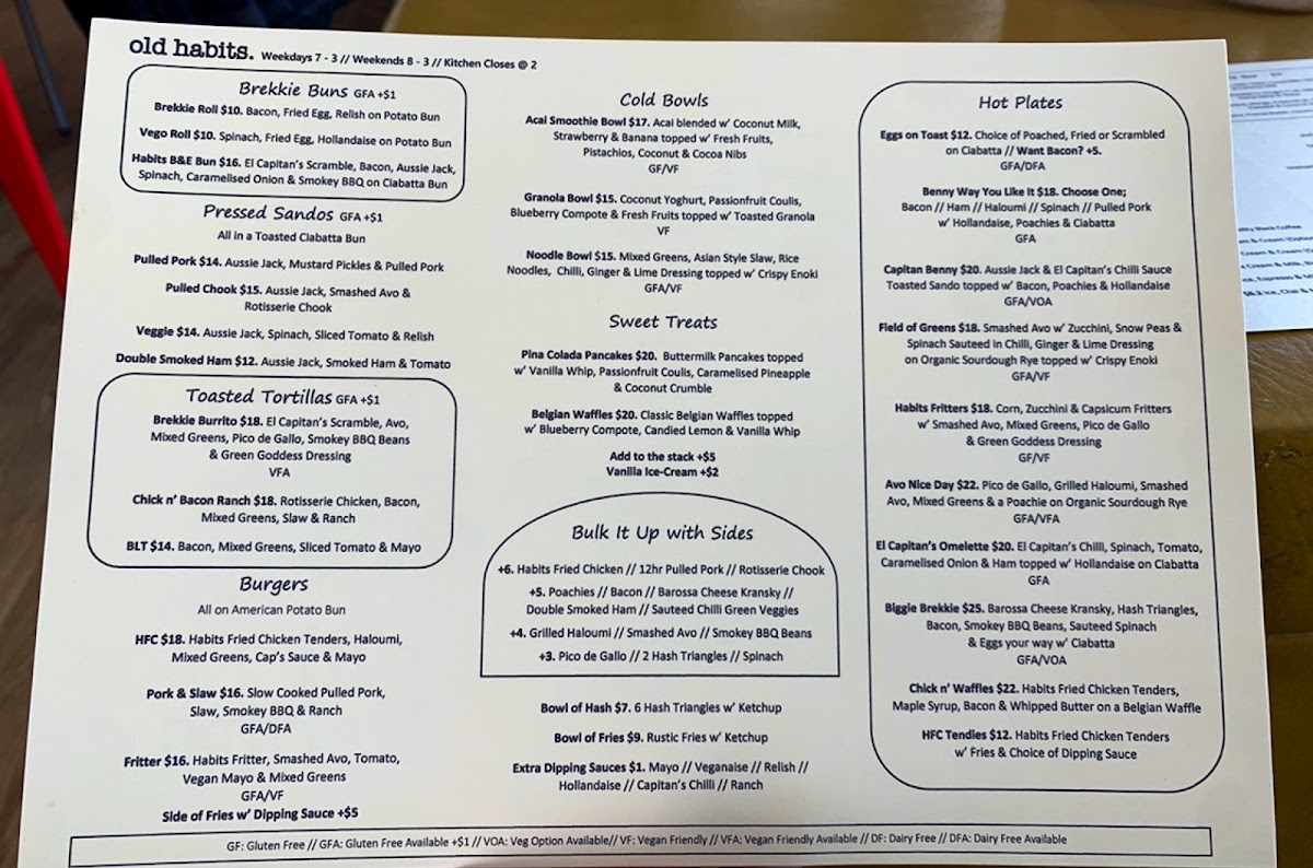 Old Habits Cafe Menu