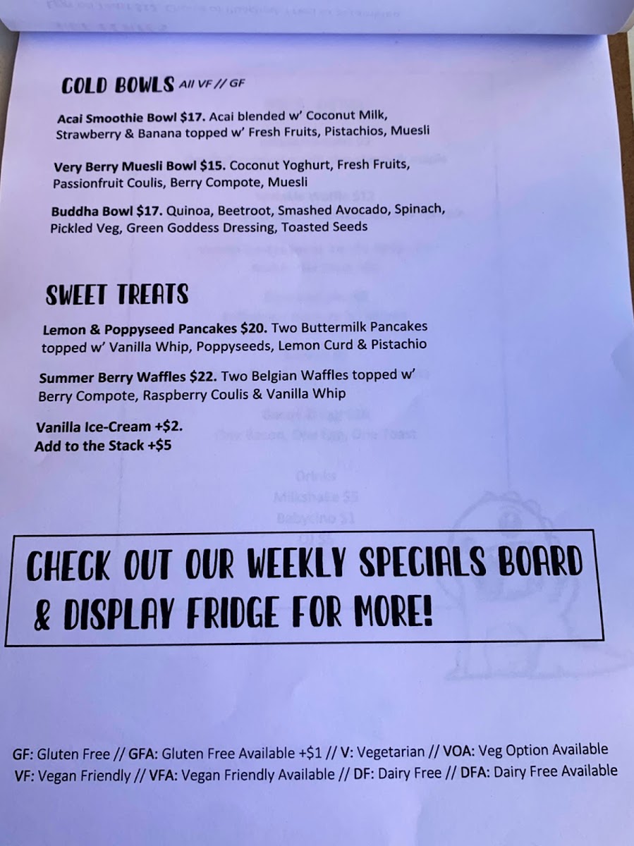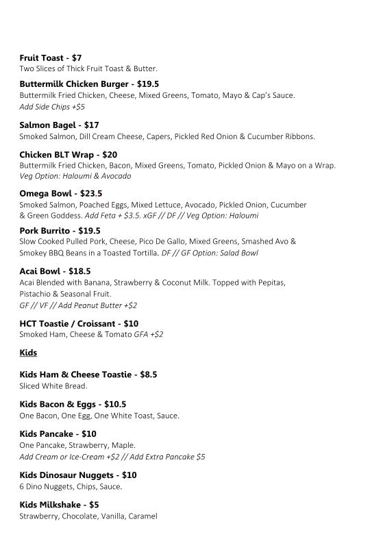 Menu highlights feature items such as salmon, soups, berry crumble pancakes, breakfast wraps, scrambled eggs on toast, chicken schnitzel burgers with fries, and acai smoothie bowls. Beverage choices include extra strong cappuccinos and iced chocolates.