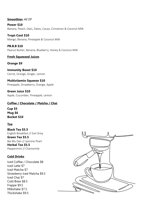 - Tea: A selection of teas including black teas like English Breakfast and Earl Grey, green teas such as Bai Mu Dan and Jasmine Pearl, and herbal options like peppermint and chamomile.